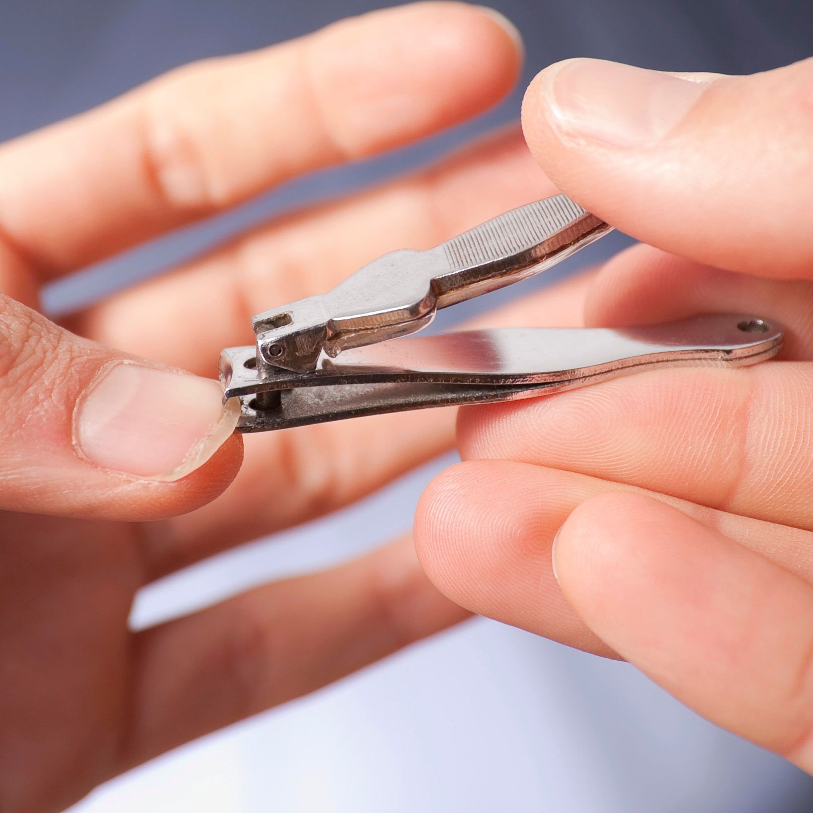Totes Nagelhorn wird vorsichtig entfernt und der Nagel behutsam rund gefeilt.
